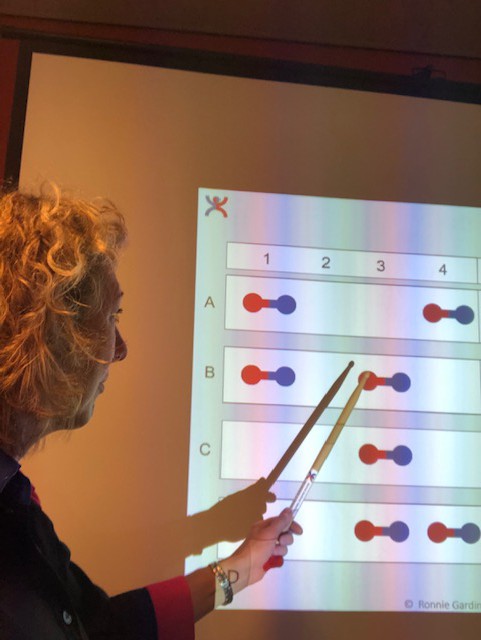 Bij elke beweging hoort een klank en een symbool, die worden getoond op een groot scherm.